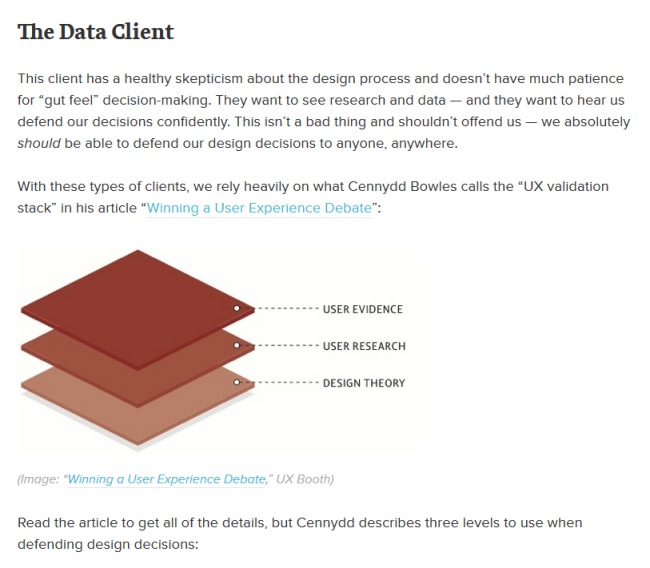 Looking at what different types of clients want, this Smashing Mag article takes you through the process of successfully selling UX-led design clearly and simply.