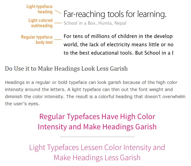 A short read that provides illustrative examples of how using lighter typefaces can benefit your design and user experience. It also outlines the pitfalls and times when you should avoid them, so it’s worth checking out even if you’re not using light typefaces at the moment.