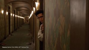 In the film New York intellectual playwright Barton Fink ventures to Hollywood in 1941 to write a Wallace Beery wrestling picture. Staying in the eerie Hotel Earle, Barton develops writer’s block. His neighbour, jovial insurance salesman Charlie Meadows, tries to help, but Barton continues to struggle as a bizarre sequence of events distracts him even further from his task.