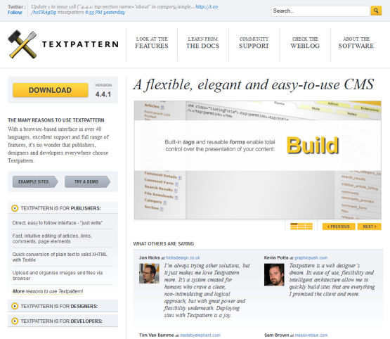 Textpattern is a standards-compliant content management system with an intuitive admin control panel and an active community. It’s surprisingly powerful yet simple to use, and benefits from a wide range of plugins and unlimited authors per install.