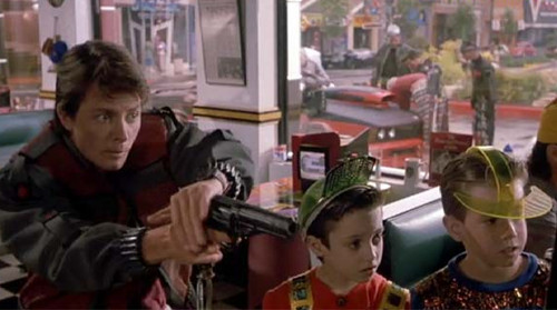 After Marty is finished acing the game, the young kids seem unimpressed. Marty, astonished at the boys’ underwhelming reaction, asks them why they are not now worshipping him following his gaming prowess, to which he gets the insolent response: “You gotta use your hands!? It’s like a baby’s toy!”