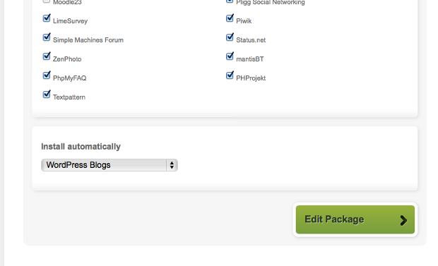 When setting up the package, just select the app you want and it will be automagically installed and ready to use when the user next logs in to eXtend. This also allows you to quickly and easily create software specific hosting packages such as 'WordPress hosting' for your customers, providing an even better experience for them.