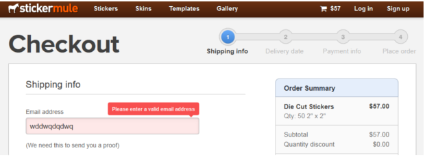 Sticker Mule let me know I haven't input my email address correctly, and explain why they need this information as well (“We need this to send you a proof”).