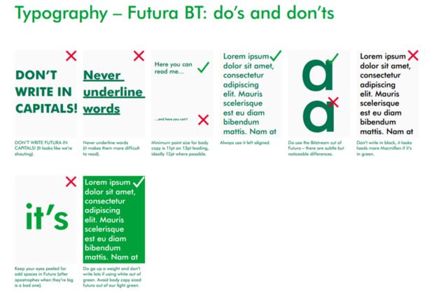 Macmillan has an excellent example of very specific brand guidelines to establish a highly consistent brand. For instance, the image below shows a range of rules within the document that Macmillan created for their secondary font, Futura BT.