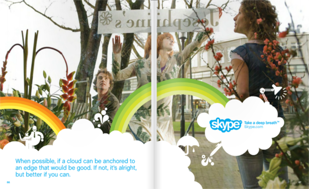 For a looser example of brand guidelines, take a look at the ones from Skype. In the image below, Skype is saying that it’s better if a cloud can be anchored to an edge, but it’s not a huge deal if this isn’t quite right.