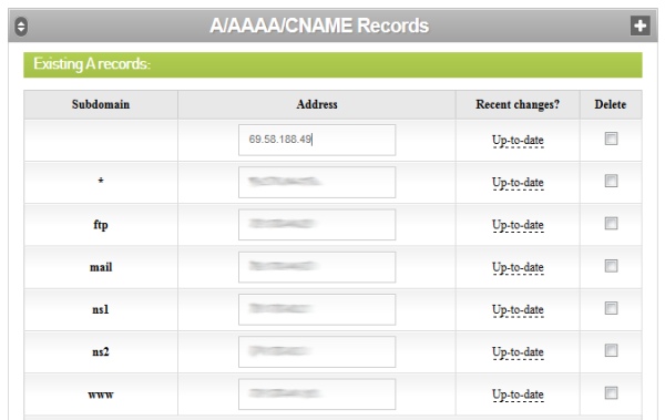 5. Change the top A record (the ‘Subdomain’ column should be blank) to 69.58.188.49, and click ‘Update DNS’: