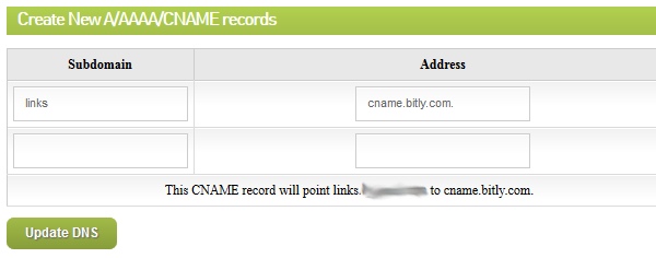 3. Scroll down to the ’A/AAAA/CNAME Records’ section, then add your subdomain (no period) in the ‘Subdomain’ box, and ‘cname.bitly.com.’ (with a period at the end) in the ‘Address’ box and click ‘Update DNS’:
