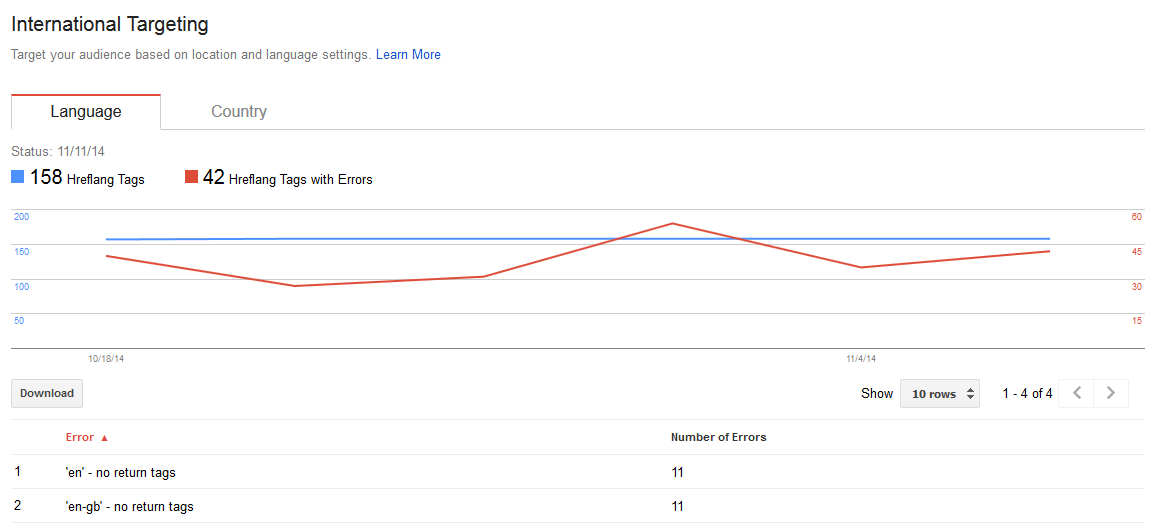 This is where you’ll see if there are any issues with your hreflang tags such as: missing return links or incorrect hreflang values. Find out more about these issues and how to troubleshoot them.