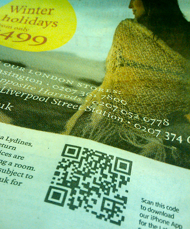 QR codes are ‘quick response codes’ offering plenty of opportunity to link digital and print media. Instead of having to manually type in long URLs, you can simply scan a code with your phone to instantly open a web page, show a phone number, connect to a wireless network and much more. There are plenty of QR code apps across the major brands, and QR codes will also work with a number of standard camera phones. If you’re interested in finding out more about the technical aspects of QR codes, check out the Wikipedia article.